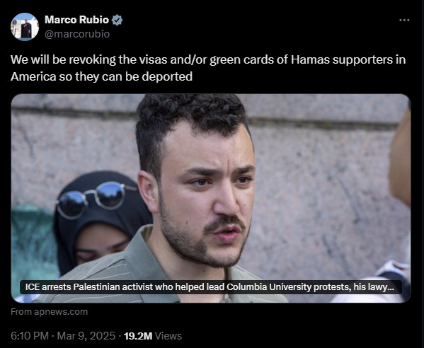 Sunday evening, Secretary of State Marco Rubio confirmed the AP's report by posting the link on X. He captioned the post, "We will be revoking the visas and/or green cards of Hamas supporters in America so they can be deported."