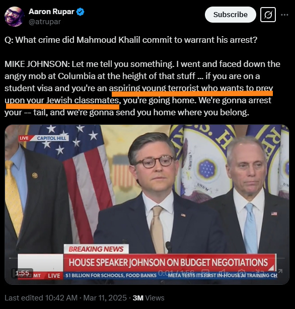 Enter House Speaker Mike Johnson, ready to do his part. When asked at his Tuesday briefing, “What crime did Mahmoud Khalil commit to warrant his arrest?” Johnson choked.