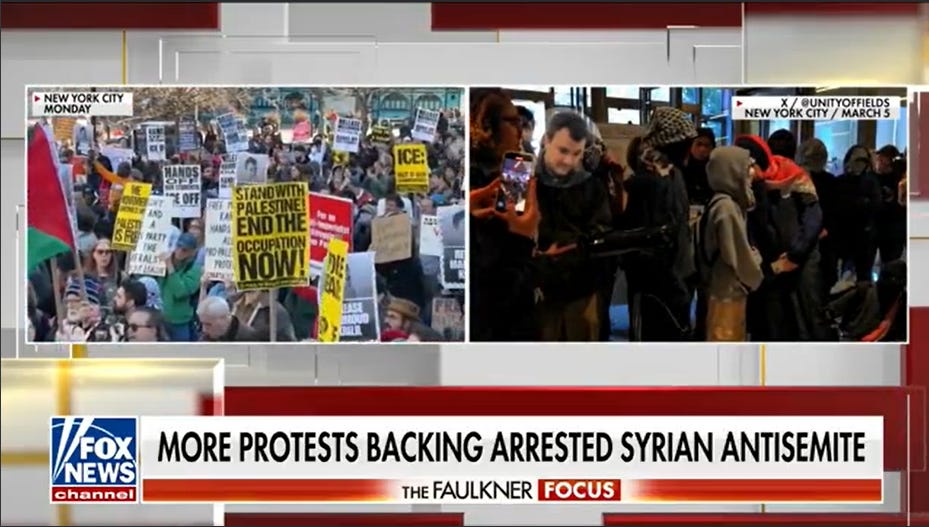 This morning, Fox News aired the following graphic when referring to the protests calling for Columbia student activist Mahmoud Khalil's release: