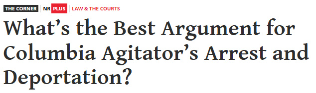 Then came conservative media, gleefully fanning the flames. For example, former Assistant U.S. Attorney Andy McCarthy weighed in yesterday with a column for The National Review titled, “What’s the Best Argument for Columbia Agitator’s Arrest and Deportation?”