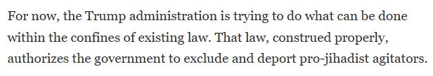 Then comes the coup de grâce. McCarthy writes: "That law, construed properly, authorizes the government to exclude and deport pro-jihadist agitators."